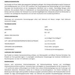Arbeiten nach technischem Sicherheitsdatenblatt, der Gebrauchsanleitung, Normen und einschlägigen Arbeitsschutzvorschriften ausführen. Technische Daten und Angaben zur Anwendung gelten für die Temperatur 25°C ± 2°C und für die relative Luftfeuchtigkeit von 55-60%. Unter anderen Wetterbedingungen kann die Trocknungs- und Abbindezeit abweichen. Mindestens haltbar bis 12 Monate ab Herstellungsdatum. Vor Kindern fernhalten. Bei Berührung mit den Augen sofort gründlich mit Wasser ausspülen und Arztkonsultieren. Der Produzent haftet nicht für Schäden als Folge anwendungstechnischer Fehler. Vor Gebrauch die speziellen Einsatzbedingungen aufmerksam durchlesen. HINWEIS: Nur restentleerte und gesäuberte Gebinde zum Recycling geben! Bei Fragen lassen Sie sich bitte vom Hersteller beraten.