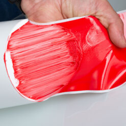 Das Dichtband G06 auf die erforderliche Länge zuschneiden. Die eine Hälfte des rückseitigen Silikonstreifens abziehen und auf die vorgesehene Fläche fest andrücken. Anschließend den zweiten Silikonstreifen abziehen und das Dichtband an die Fläche kleben. Das Dichtband muss beim ersten Aufkleben richtig positioniert sein. Ein Korrigieren funktioniert abhängig vom Untergrund nur noch bedingt. Eine Überlappung von mindestens 5 cm berücksichtigen. Anschließend das Butyldichtband mit der Verbundabdichtung überarbeiten.