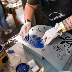 Der Untergrund sollte sauber, trocken und entfettet sein und je nach gewünschtem Endergebnis gestrichen werden. Werkzeuge: Schablone, Pinsel oder Schwamm, Papierklebeband, Wasserwaage, Chalk-it Kreidefarbe.