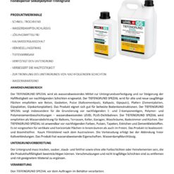 Der TIEFENGRUND SPEZIAL wird als wasserabweisendes Mittel zur Untergrundsverfestigung und zur Steigerung der Haftfestigkeit vor nachfolgenden Schichten eingesetzt. Der TIEFENGRUND SPEZIAL wird für alte und neue saugfähige Flächen empfohlen wie Beton, Gasbeton, Putze (Kalkzementputz, Kalkputz, Gipsputz), Platten (Zementplatten, Gipsplatten, Gipskartonplatten). Das Produkt eignet sich gut für beheizte Bodenkonstruktionen. Der TIEFENGRUND SPEZIAL sorgt insbesondere für die Grundierung vor nachfolgenden 1- und 2-komponentigen, Polymer- und Polymerzementbeschichtungen – wasserabweisenden LEVEL+-Dichtbahnen. Der TIEFENGRUND SPEZIAL wird empfohlen als Wasserabdichtung für Balkons, Terrassen, Keller, Garagen, Waschräume, Badezimmer und Küchen. Der TIEFENGRUND SPEZIAL ist anwendbar vor nachfolgenden Farben, Putzen, Tapeten, Estrichen und Zementklebstoffen. Es ist vorgesehen für vertikale und horizontale Flächen in Innenräumen als auch im Freien. Das Produkt ist koaleszent- und lösemittelfrei. Kaum Filmbildend nach dem Austrocknen. Die Verkieselung erfolgt bei der Abbindung freier Kalkverbindungen. Das Produkt hat wasserabweisende Eigenschaften. Wasserdampfdurchlässig.
