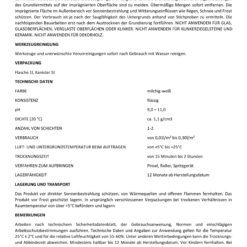 Arbeiten nach technischem Sicherheitsdatenblatt, der Gebrauchsanleitung, NORMen und einschlägigen Arbeitsschutzvorschriften ausführen. Technische Daten und Angaben zur Anwendung gelten für die Temperatur 25°C ± 2°C und für die relative Luftfeuchtigkeit von 55-60%. Unter anderen Wetterbedingungen kann die Trocknungs- und Abbindezeit abweichen. Mindestens haltbar bis 12 Monate ab Herstellungsdatum. Vor Kindern fernhalten. Bei Berührung mit den Augen sofort gründlich mit Wasser ausspülen und Arztkonsultieren. Der Produzent haftet nicht für Schäden als Folge anwendungstechnischer Fehler. Vor Gebrauch die speziellen Einsatzbedingungen aufmerksam durchlesen. Bei Fragen lassen Sie sich bitte vom Hersteller beraten. HINWEIS: Nur restentleerte und gesäuberte Gebinde zum Recycling geben! Vor Gebrauch das Sicherheitsdatenblatt und das technische Merkblatt für dieses Produkt genau durchlesen.