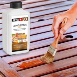Leinölfirnis gemäß ISO 150 besteht aus reinem Leinöl, in welches Trockenstoff (Sikkativ) bei höherer Temperatur eingearbeitet worden ist. Leinöl ist zur Imprägnierung, Konservierung und Pflege von Holz und Holzwerkstoffen bestimmt. Es zieht sehr gut ein und dringt tief ins Holz ein. Es ist ein umweltfreundliches Produkt ohne Lösungsmittel. Das Produkt dringt tief in die Holzstruktur ein. Es bildet keine zusätzliche Schicht auf der Oberfläche. Die Verwendung von Leinöl schützt die imprägnierten Oberflächen vor schädlichen Witterungseinflüssen, vor Feuchtigkeit, vor mikrobiologischen Verseuchung wie Schimmelpilz, Pilz, Moos und Flechte. Leinöl wird am häufigsten für Holztüren, Fensterrahmen, Fensterbänke, Fußböden, Fassadenpaneelen, Gartenmöbeln, Pergolen und Holzzubehör wie Schächte und Griffe verwendet. Leinöl kann für alle Holzarten verwendet werden: Laub-, Nadel- und weiche Exotenhölzer. Achtung! Aufgrund der unterschiedlichen Holzarten muss vor jeder Anwendung immer ein Test durchgeführt werden, um den erwarteten Effekt zu überprüfen. Nach dem Einölen kann das Holz unter dem Einfluss von Sonne und Regen dunkler werden. Eine kältebedingte Trübung in den Ölen ist reversibel und kann durch Erwärmen auf über 40 °C beseitigt werden. BEACHTUNG! Selbstentzündung durch Autoxidation von mit dem Produkt getränkten Lappen möglich.
