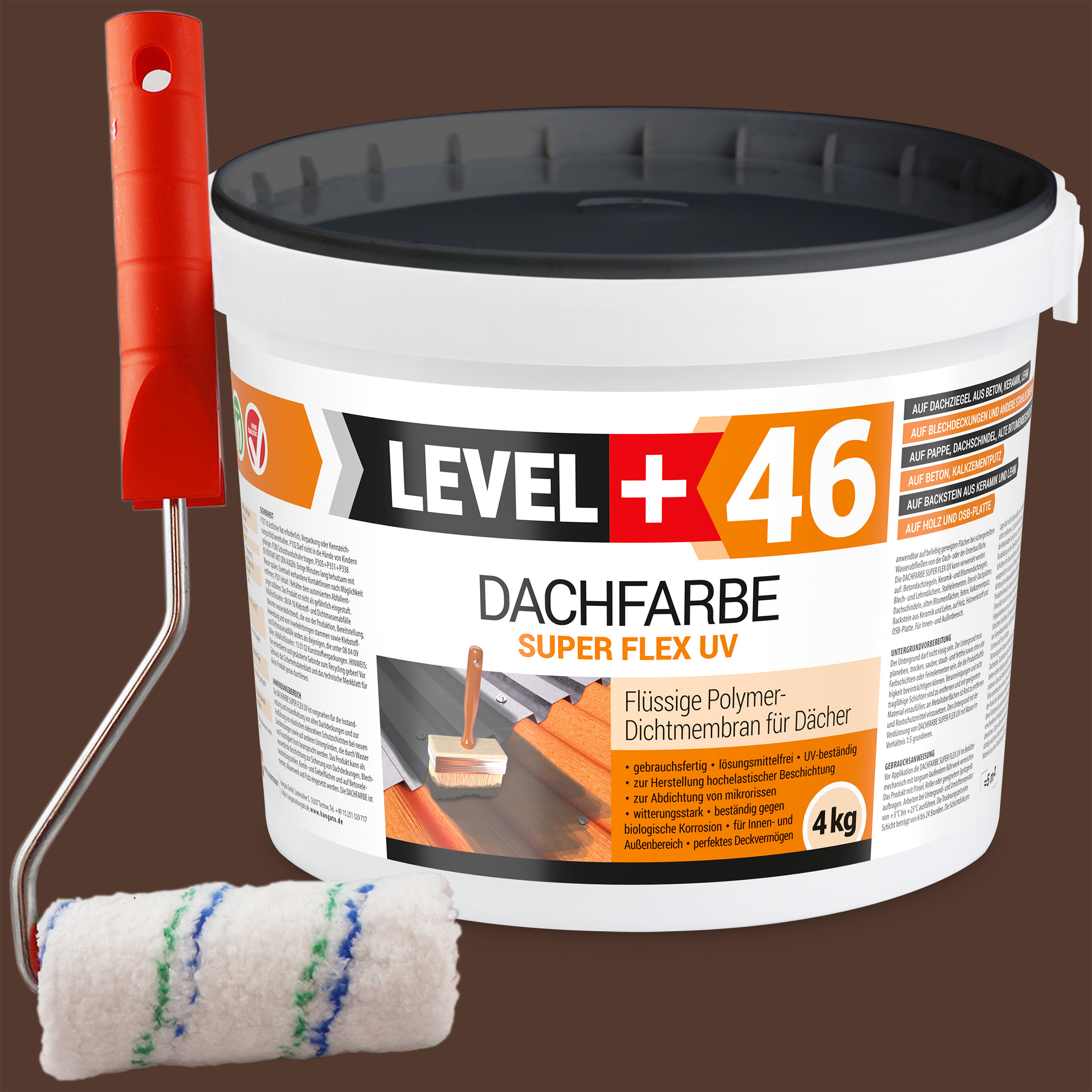 Dachfarbe 4kg Braun Flexible Sockelfarbe Dachlack UV-beständig + Farbroller 10cm mit Bügel SET L+46