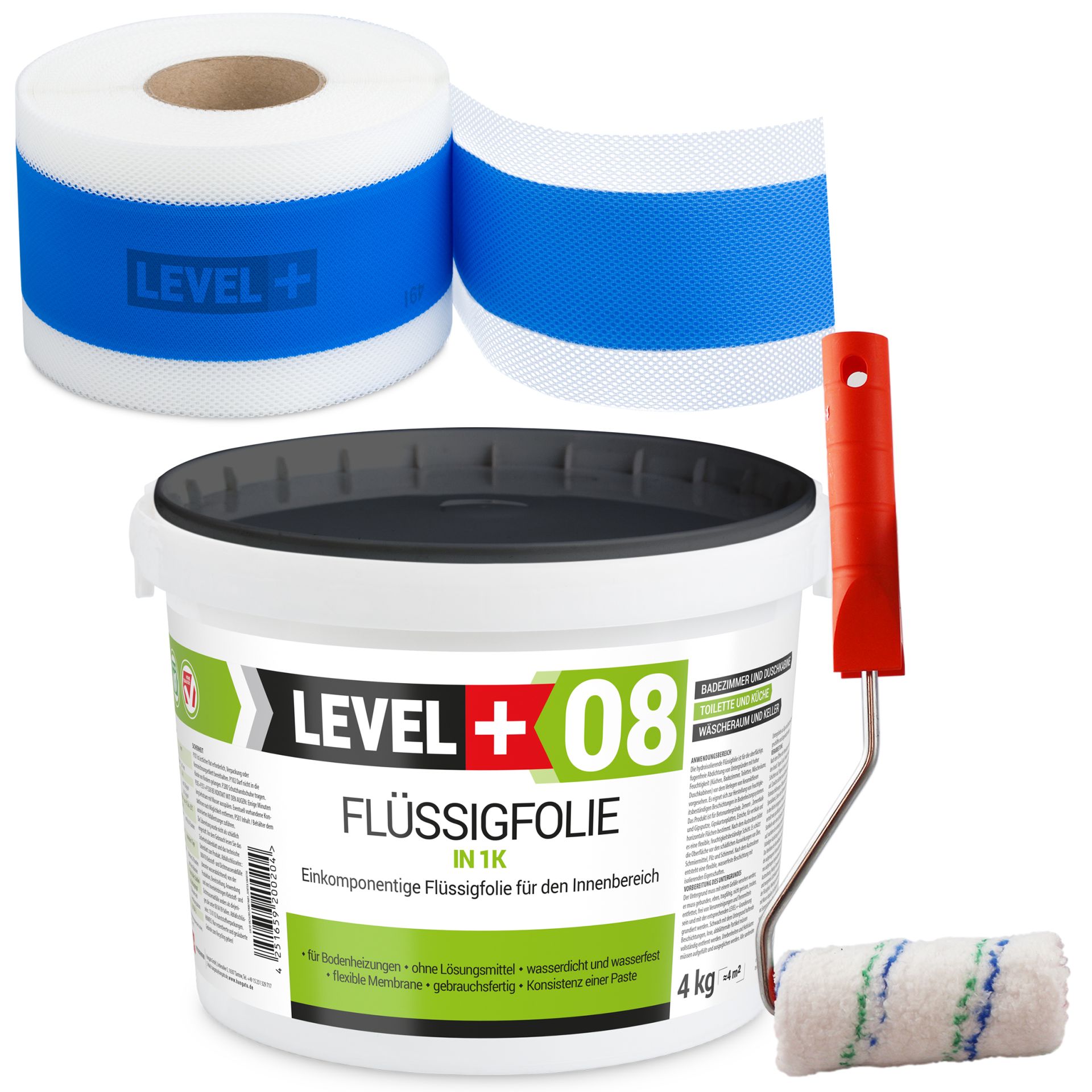 Dichtset Abdichtung Flüssigfolie 4kg Dichtband 5m Farbroller 10cm Dichtband LEVEL+ SET294