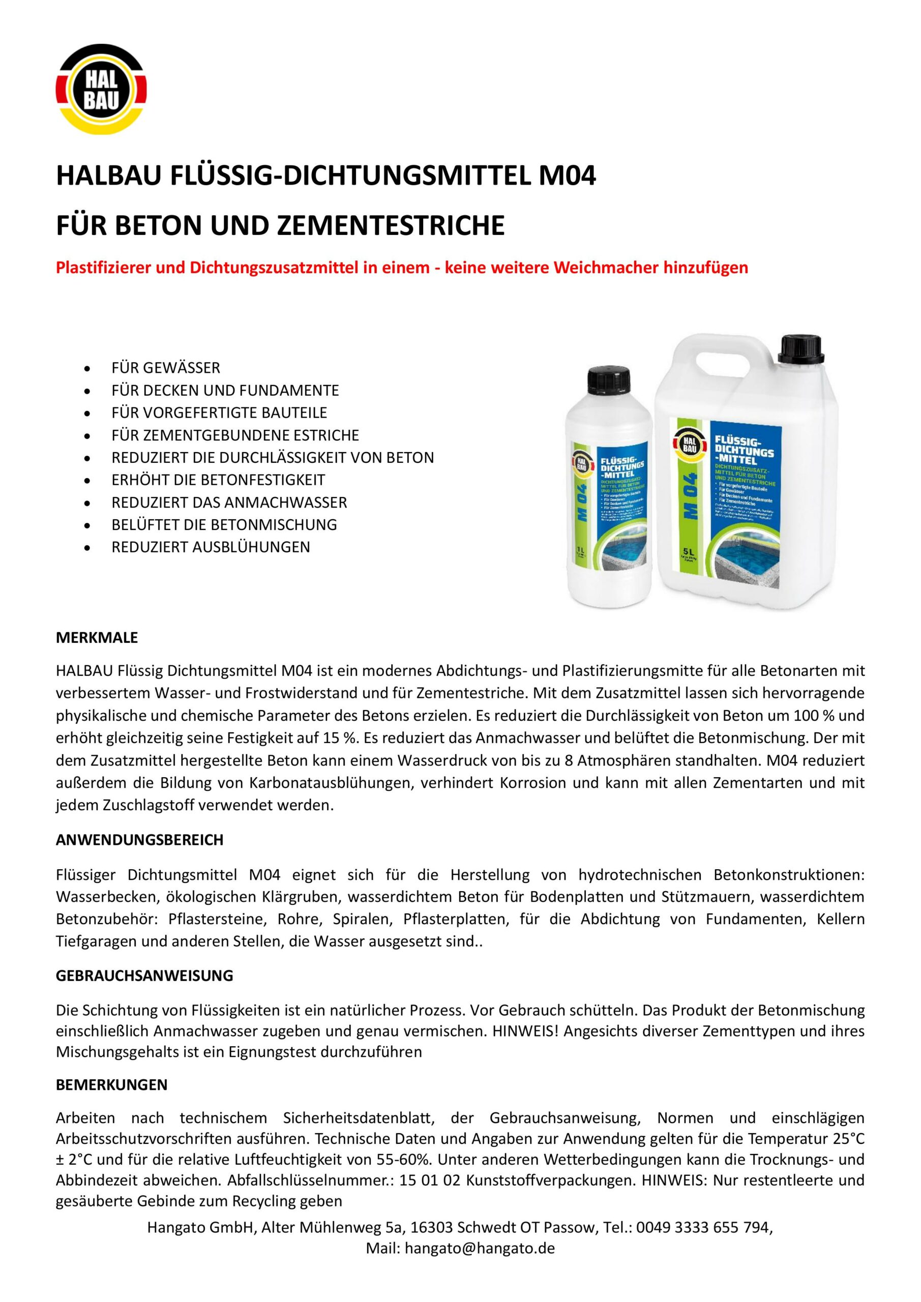 HALBAU FLÜSSIG DICHTUNGSMITTEL FÜR BETON UND ZEMENTESTRICHE M04