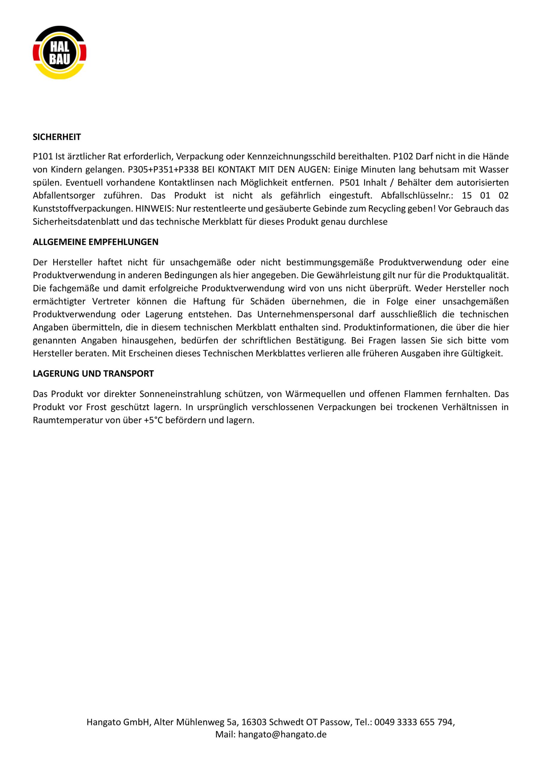 Arbeiten nach technischem Sicherheitsdatenblatt, der Gebrauchsanleitung, Normen und einschlägigen Arbeitsschutzvorschriften ausführen. Technische Daten und Angaben zur Anwendung gelten für die Temperatur 25°C ± 2°C und für die relative Luftfeuchtigkeit von 55-60%. Bei Berührung mit den Augen sofort gründlich mit Wasser ausspülen und Arzt konsultieren. Der Produzent haftet nicht für Schäden als Folge anwendungstechnischer Fehler. Vor Gebrauch die speziellen Einsatzbedingungen aufmerksam durchlesen. Abfallschlüsselnr.: 15 01 02 (Kunststoffverpackungen). HINWEIS: Nur restentleerte und gesäuberte Gebinde zum Recycling geben! Bei Fragen lassen Sie sich bitte vom Hersteller beraten.