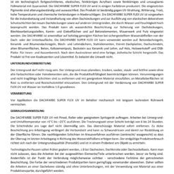 Die DACHFARBE SUPER FLEX UV mit Pinsel, Roller oder geeignetem Spritzgerät auftragen. Arbeiten bei Untergrund- und Umlufttemperatur von +5°C bis +25°C ausführen. Die Trocknungszeit einer Schicht beträgt von 6 bis 24 Stunden. Die Schichtdicke pro Lage darf nicht übermäßig sein. Das überschüssige Material sofort entfernen. Zu dicke Beschichtung pro Arbeitsgang verlängert die Verbundzeit und kann zu Schwundrissen und damit zur Rissbildung an der Oberfläche führen. Die nachfolgenden Schichten im Kreuzverfahren ausführen (senkrecht/ waagerecht) so dass der Überzug im letzten Arbeitsgang in Richtung des Wasserabfließens erfolgen kann. Der endgültige Produktverbrauch richtet sich nach der Untergrundsqualität (Porosität) und ist in einem Probetest am Objekt zu ermitteln.