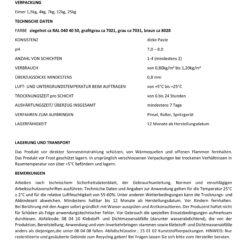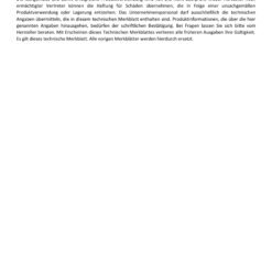Der Hersteller haftet nicht für unsachgemäße oder nicht bestimmungsgemäße Produktverwendung oder eine Produktverwendung in anderen Bedingungen als hier angegeben. Die Gewährleistung gilt nur für die Produktqualität. Die fachgemäße und damit erfolgreiche Produktverwendung wird von uns nicht überprüft. Weder Hersteller noch ermächtigter Vertreter können die Haftung für Schäden übernehmen, die in Folge einer unsachgemäßen Produktverwendung oder Lagerung entstehen. Das Unternehmenspersonal darf ausschließlich die technischen Angaben übermitteln, die in diesem technischen Merkblatt enthalten sind. Produktinformationen, die über die hier genannten Angaben hinausgehen, bedürfen der schriftlichen Bestätigung. Bei Fragen lassen Sie sich bitte vom Hersteller beraten. Mit Erscheinen dieses Technischen Merkblattes verlieren alle früheren Ausgaben ihre Gültigkeit. Es gilt dieses technische Merkblatt. Alle vorigen Merkblätter werden hierdurch ersetzt.