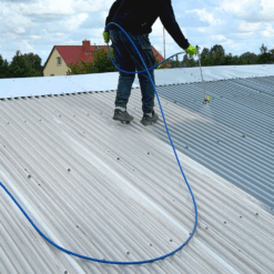 Technologische Pausen sollen früher geplant werden, z.B bei Dachecken, Dachknicke oder Dachsockelbasis. Kann man nicht zulassen, dass die Arbeiten bei der ausgewählten Elemente/Teile unterbrochen werden, bevor sie fertig sind. Andernfalls ist der Punkt der Verbindung möglicherweise sichtbar – verschiedene Farbtöne der getrockneten Beschichtung. Die Farbe der verschiedenen Produktpartien kann geringfügig voneinander abweichen. Daher sollten die Arbeiten an einer Dachebene ständig und ohne Unterbrechungen, mit der Verwendung von Material aus einer Produktionspartie, durchgeführt werden.