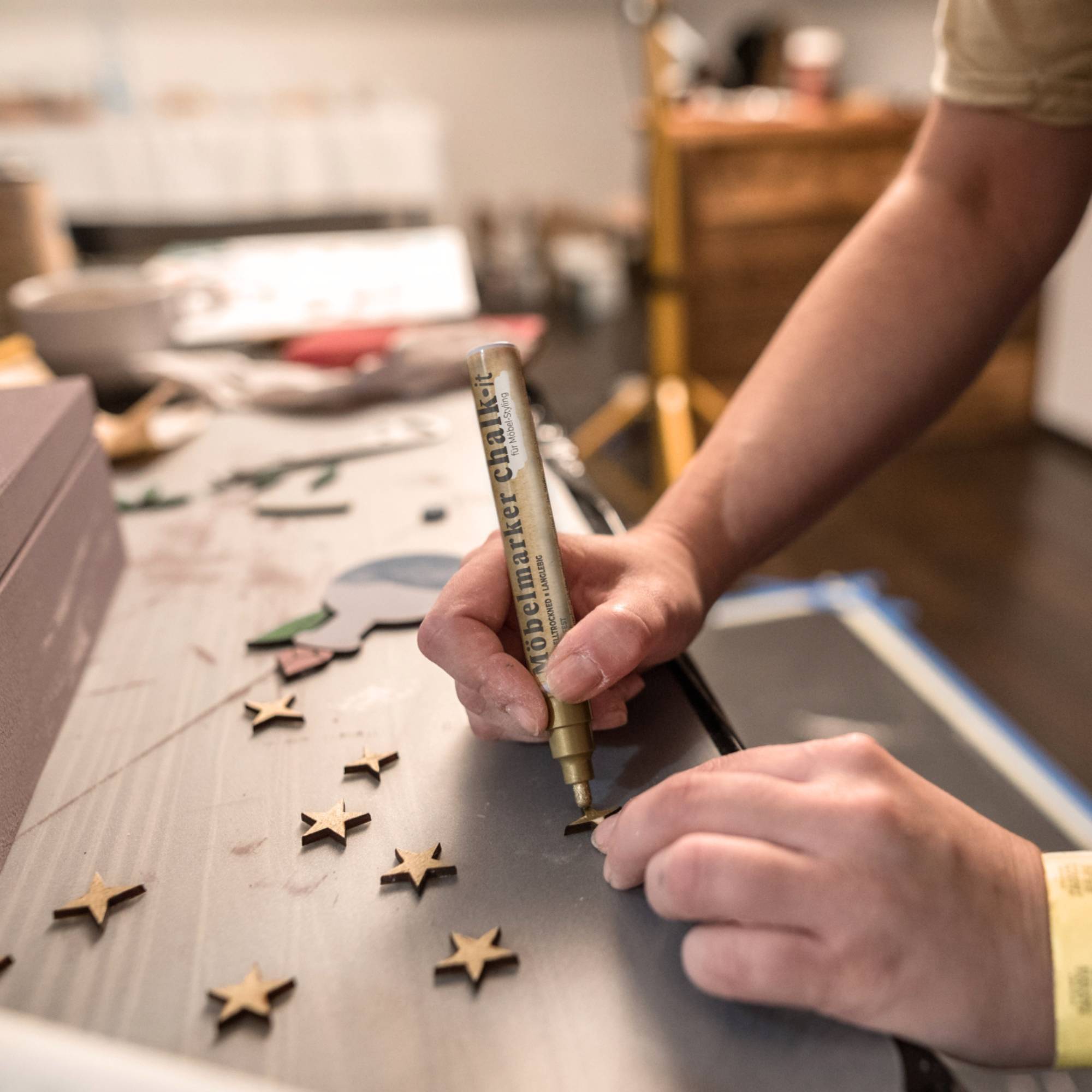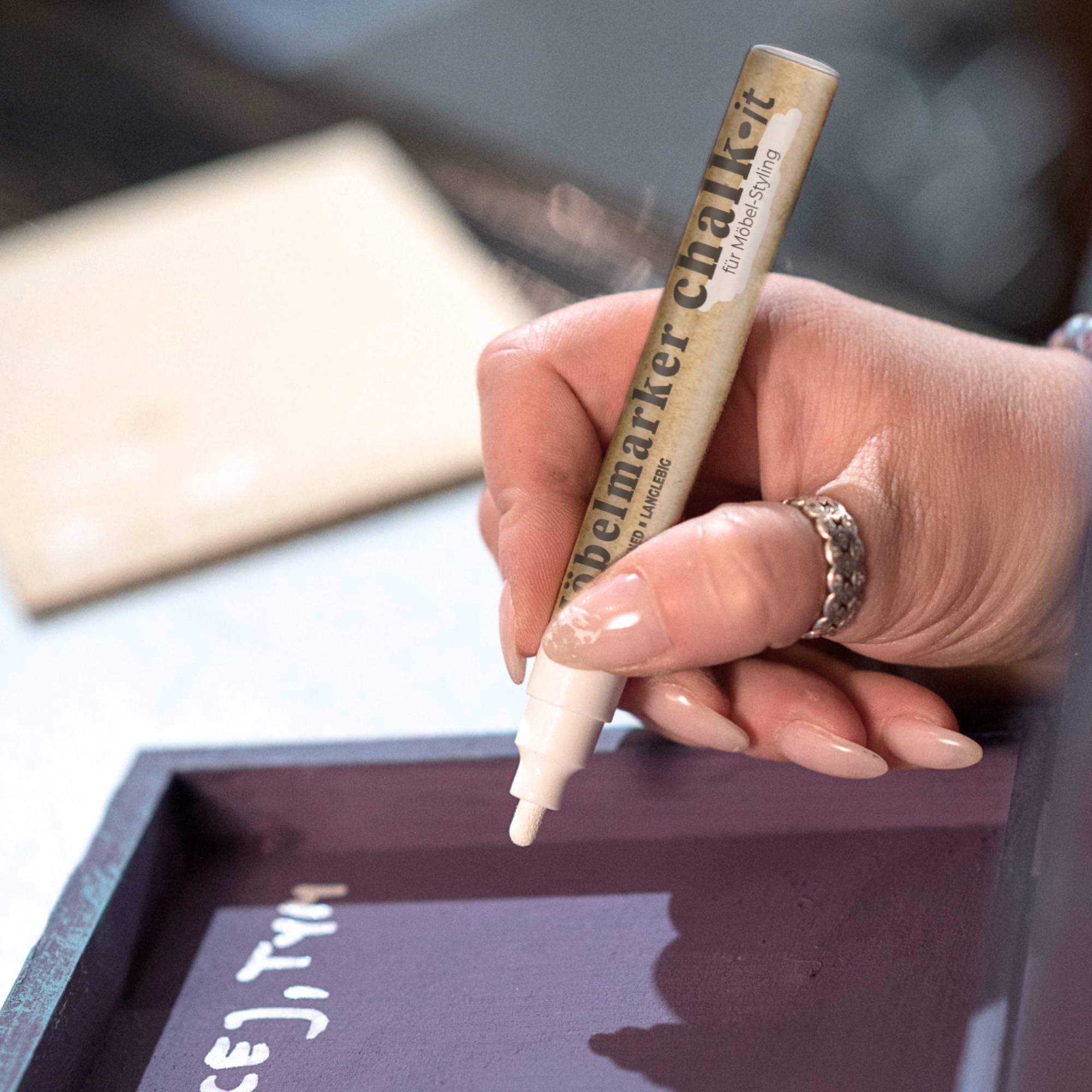 Der schnell trocknende, wasserfeste und extrem haltbare Chalk-it Marker ist das perfekte Werkzeug für das Styling und die Dekoration von Möbeln. Dank der speziellen Formel und der präzisen Spitze können Sie Projekten auf Holz-, Metall-, Glas-, Gummi- und Steinoberflächen eine einzigartige Note verleihen.